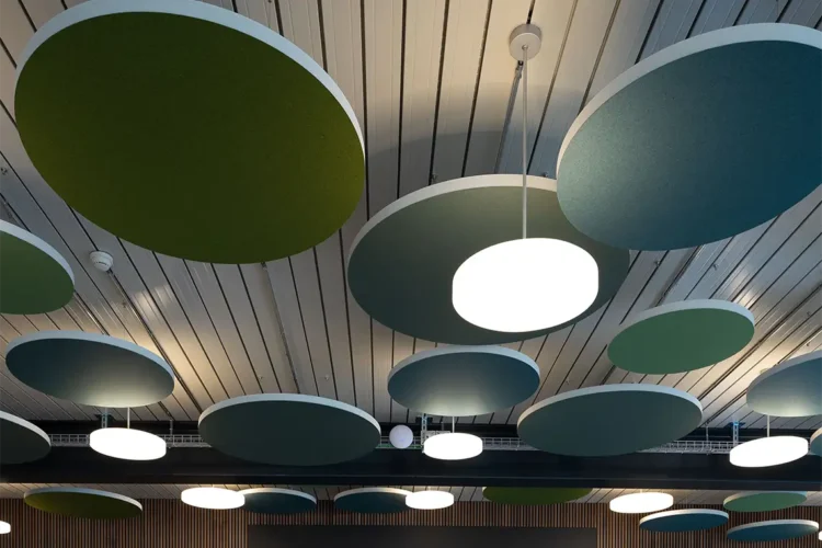 Die SilentPET-Elemente in runder Form und mit einer Stärke von 50 mm wurden in verschiedenen Grün-Tönen ausgewählt, um das Design des Restaurants zu unterstreichen und gleichzeitig eine hervorragende akustische Leistung zu erzielen. Die Filzfarben und Grössen von der Blazer Kollektion bieten den Vorteil hoher Flexibilität, sodass sie an die individuellen Bedürfnisse jedes Raums angepasst werden können. Die akustische Optimierung, kombiniert mit ästhetischem Design, sorgt für eine angenehme Atmosphäre, in der sich die Gäste wohlfühlen und gerne verweilen.
